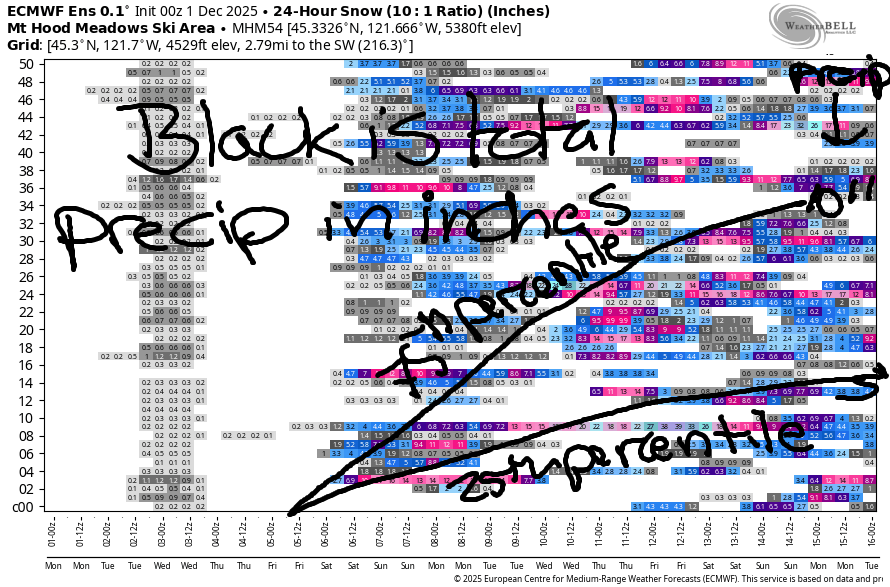 Hey skiers and snowboarders! The ski season waiting game continues, and we still have near-zero clarity on the p-type and amounts through the middle of next week. The GFS is trending slightly warmer, but it still hints at snow. The Euro ensemble is unapologetically too warm for snow. Looking at this a different way… the Mt Hood snow forecast via the Euro ensembles through next Monday morning has 2.5” of snow at the 10th percentile and 46” of snow at the 90th percentile. That’s a HUGE range. In an interesting twist, despite the GFS deterministic being quite cold, the GFS ensembles have 0.2” to 11” of snow in that same time frame.