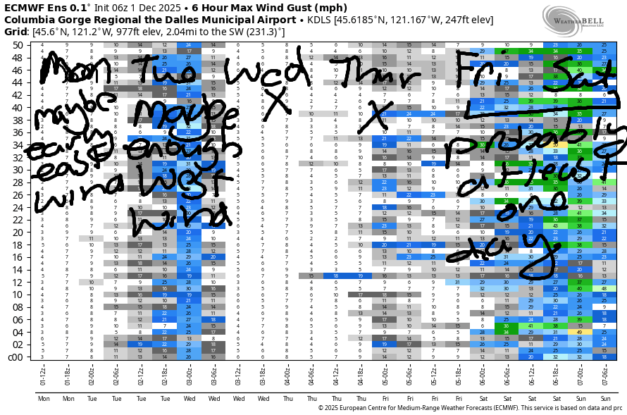 Hi friends! Gorge wind bounces around between east and west for the next few days. Models continue to hint at stronger westerlies on Friday or Saturday, which you may be able to count on because I’m heading out on retreat Friday! Murphy’s Law!
