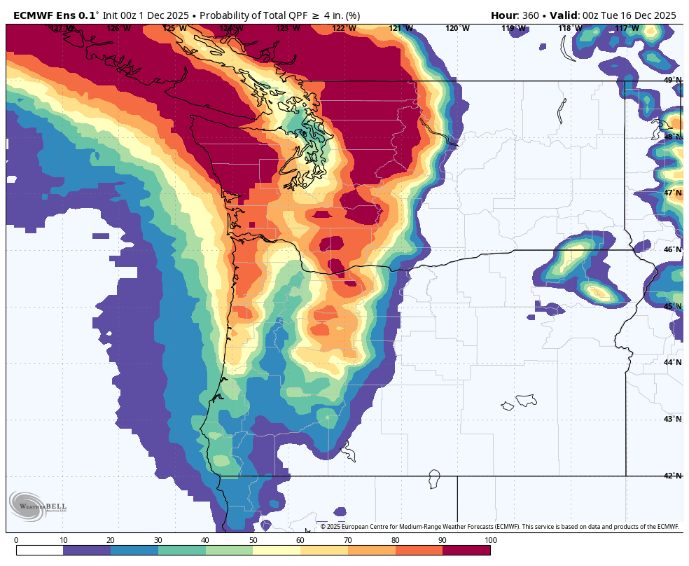 Just how wet are we talking? Through next Tuesday for the Cascades, models have 100% chance of 2” inches of rain, 70-90% chance of 4+” of moisture, and 20-30% chance of 8+” of moisture. There’s even a 10-20% chance of 15+” of moisture for Mt. Adams! It’s harder to figure out the percentages for the lowlands due to challenges associated with model resolution. Let’s just say that for this time period, the chances of areas west of The Dalles receiving 4+” of rain or more are non-zero. WET! Safe travels. -TATAS