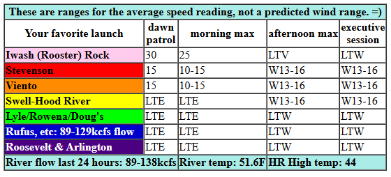 Monday kicks off with easterlies at 30mph near Iwash and 20mph near Stevenson with 15mph at Viento. You’ll get a couple hours of this. By late morning or early afternoon, the wind shuts down. After 1pm, it switches to westerly at 13-16mph from Stevenson to the Hatchery with less wind to the east. River flow over the last 24 hours was 89-138kcfs, river temp is 51.6F, and high temp forecast is 44F, which puts us under 100F total for water + air. Be safe out there!