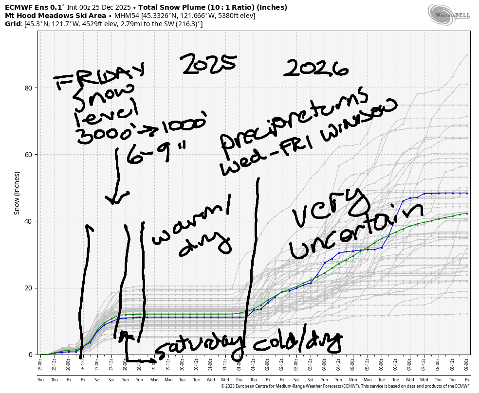 Precipitation returns to the Mt Hood snow forecast sometime in the Wednesday through Friday window. As of right now, too much uncertainty exists to make a precipitation-type forecast, so I’ll hold off. Best guess: probably some rain at the front end and then some snow, but let’s not get too tied to that.