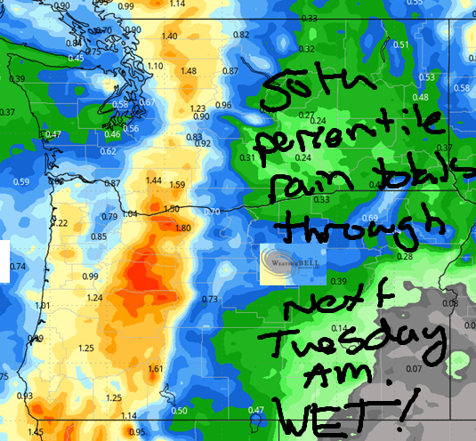 Good morning, neighbors! IT’S RAINING AT MY HOUSE! It might be raining at your home too, especially if you’re east of Hood River. Over the next several days, more rain is on the way. You can take a look at the 50th percentile map of the ECMWF ensembles to get a rough idea of how much rain is coming, but know that there’s still quite a bit of range in the possibilities; The Dalles, for example, has an intraquartile range (25%-75% percentile) of 0.5” to 0.9” by next Tuesday. Cool. That’s a lot of rain!