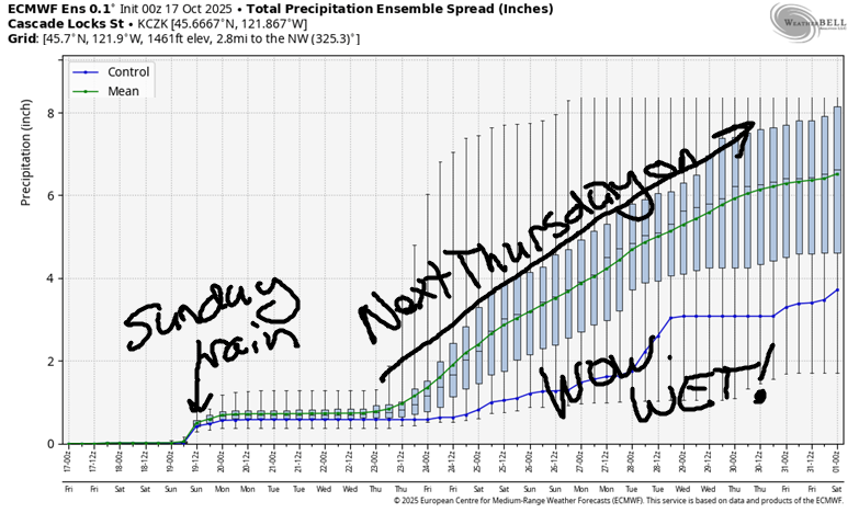 Good morning, neighbors! Here we are again: it’s Friday. For some of us, that doesn’t mean anything special. For the rest of us, may the last day of your work week be an ease-filled one! Upcoming weather this weekend: sunny and lovely, perfect autumn weather on Saturday. Rainy, rainy west of Mosier on Sunday with periods of rain to the east. Dry weather returns to start next week. As we approach next weekend, chances of rain get higher and higher – lots of range persists in the ensembles, but a truly soaking wet time is possible!