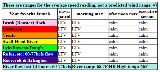 Thursday won’t have much more on offer: the wind starts calm, turns easterly at 10-15mph near Cascade Locks midday, and goes calm again in the afternoon. High temp: 66F under mostly cloudy sky with intermittent showers.