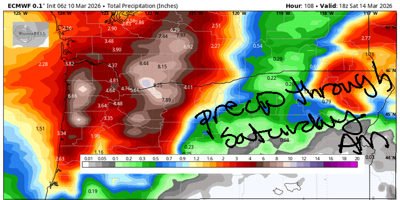 I’ll get more into the deets tomorrow. Running short on time today. On Friday night, another round of heavy precip is forecast. The snow level falls to 1500′ or so, but most of the moisture will be done prior to the cooler air arriving. Saturday looks dry. On Sunday, temps start warming as high pressure builds inland. That’s all I’ve got for you now (PS, it’s snowing on Underwood Mountain โ I can see it!). We’ll dive more into the deets tomorrow. Safe travels. -TATAS