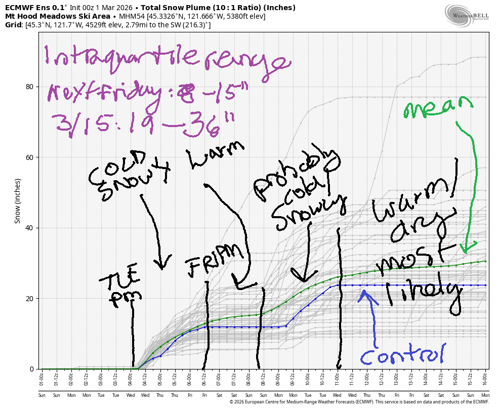 We’ll stick with dry weather until Tuesday afternoon when honest-to-goodness snow is in the forecast. The intraquartile range through next Friday is 12-17โ, and the range through 3/15 is 27-47โ. It’s worth noting that the 90th percentile is 85โ – that huge range is due to both fluctuations in temp and the potential for snow to exceed expectations thanks to W/NW wind.