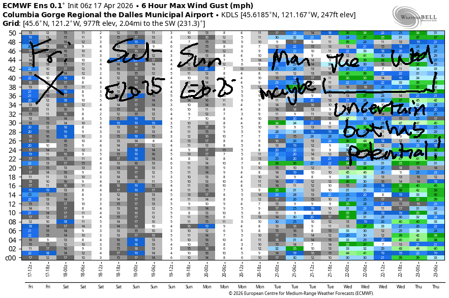 Hi friends! It’s another beautiful morning in the Gorge. We’re set for a light wind day today (Friday) followed by moderate easterlies for the weekend. Uncertainty climbs starting Monday. There is some indication of solid west wind Tuesday and Wednesday, but models are far from agreeing on the details.