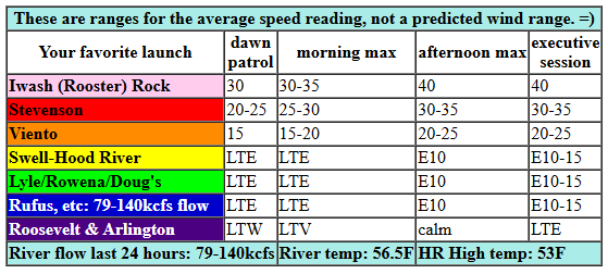 Easterlies linger on Wednesday morning: 30-35mph at Stevenson and 20-25mph at Iwash with 20mph at Viento. Get it quickly. The wind shuts down midday and turns westerly in the afternoon: gusty 14-17mph from Stevenson to Viento (or maybe the Hatch), calm or nearly so from Swell (or maybe Hood River) to Doug’s, and gusty 19-23mph from Rufus to Boardman. Expect very up-and-down conditions in the afternoon due to instability and showers. High temp: 56F.