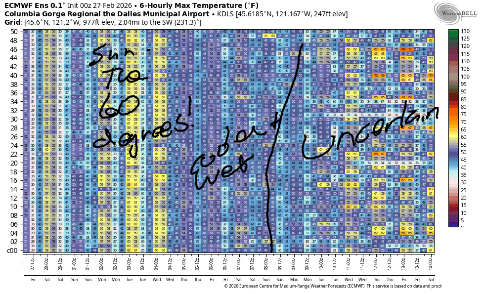 I’ll be gone Monday and Tuesday, which is super-duper-sad, because here in the Gorge, we’re expecting 60 degrees, sunshine, and light west wind both days. (crying faces for me) A weather system slides in from the NW on Tuesday night, and cooler, damper weather is forecast for the next few days.