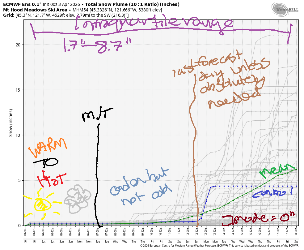 Hey skiers and snowboarders! It’s Friday morning, and it’s a packed pow day on Mt. Hood. Get it as early as you can, because the sun will warm the snow quickly and turn it sticky. The snow surface will be transitioning towards granular over the weekend thanks to 50+ degree highs on the slopes. We’re back to colder weather Tuesday (ish), but at best, a trace of snow is forecast. Not much precip is in the forecast through next week. As a matter of fact, the intraquartile range through the 18th of April is just 2-8” snowfall.