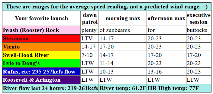 Monday starts off with pressures of 30.27/30.21/30.19 and clear sky in the metro area. A weak system is forecast to move through today, but it won’t do much other than add high clouds; we’re relying on offshore high pressure and desert heat. The day started with light/variable wind. By late morning, we’ll have 14-17 from Stevenson to Mosier. In the afternoon, Stevenson-Doug’s rises to 20-23. Swell is likely to be a bit lighter with 17-20, although a short period of 20-23 late morning to early afternoon can’t be ruled out. Rufus joins in the evening. River flow over the last 24 hours was 219-261kcfs, river temp is 61.2F, and high temp forecast is 77F with sunshine all day.