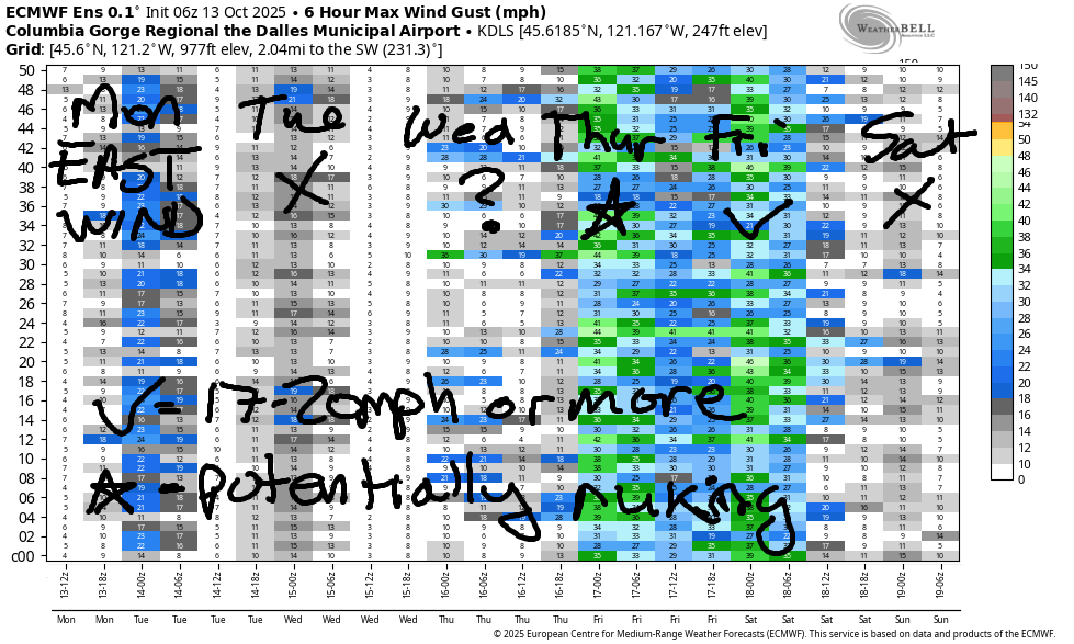 Low clouds slide inland on Wednesday night and continue to build into the day Thursday as a trough settles in at the coast. This gives us strong westerlies from Viento to Mosier in the morning and strong westerlies from Stevenson (?) or Viento (yes) to Rufus or maybe even Arlington in the afternoon. The Euro ensemble isn’t fully on board with the Rufus/Arlington scenario, but it seems like a good setup to me. In an interesting twist, the GFS deterministic basically shuts the wind off on Friday while the Euro repeats Thursday. So… no consensus there yet, but I’m leaning towards โwindyโ for both days. Weekend: Saturday looks light. Sunday has some potential as a weather system approaches. That’s all for now. Have a great day. See you on the Nch’i Wana!