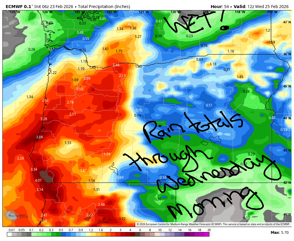 Good morning, neighbors! A couple of soaking wet days are on tap, even if you live in the desert, even if you live in south Wasco County, even if you live in Gilliam County, and especially if you live in Hood River or Skamania County. WET! WET! WET! Commute to/from the metro area: WET! Starting Wednesday midday, we’ll be dry for a while. DRY!