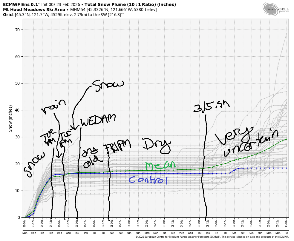 Monday brings snow, dense snow, but snow, to Mt Hood. The snow level will be around 4000′ early, 3000′ mid-morning, and temps will slowly rise overnight. A small difference in the location of this frontal system will make the difference between snow and rain. During the day, we’re expecting 0.4” water equivalent, for 4-5” snow at 5000′ with temps in the low 30s at 5000′; expect a break in the snow late morning. From late afternoon on into Tuesday morning, we’re expecting 1.0” water equivalent with temps ranging from -1C to +2C. This will probably result in very wet snow and potentially periods of mixed precip. I’m really guessing here, but let’s call for 3-6” new snow overnight. Maybe we’ll get lucky and get a foot! Wind will be W 25 this morning, SW 10-20 this afternoon, and SW 5-15 after midnight.