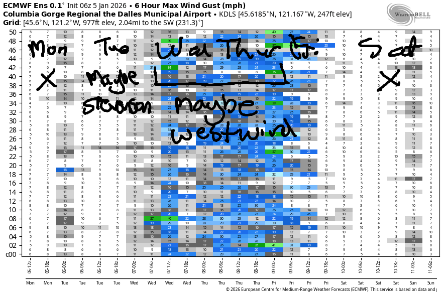 After that Wednesday systems moves through, we’re left with a more westerly flow aloft. Models hint at the possibility of west 21-24mph all through the Gorge. That’s your best chance this week to get on the river. Friday through Sunday are likely to be calm, or at least quite light, thanks to a building ridge of high pressure. By Monday, we should have strong easterlies in response to this setup. It’s worth noting that these easterlies will be somewhat warmer than our usual winter east wind, and could be enticing for many. By “many”, I mean maybe even me! Hope to see you on the Nch’i Wana soon!