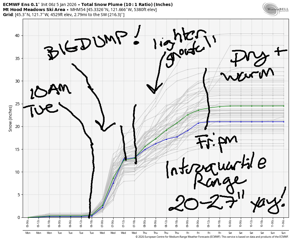 Hey skiers and snowboarders! Finally some awesome news in the forecast. Starting Tuesday afternoon, we’re heading into a period of heavy snowfall. That’s followed by cool temps and moderate snowfall much of the time through Friday. Beyond that, warm and sunny weather returns to the slopes, but we should have 20-27” of new snow on the ground by then. That range, btw, is the intraquartile range – 25th percentile to 75th percentile. Sounds awesome, right???