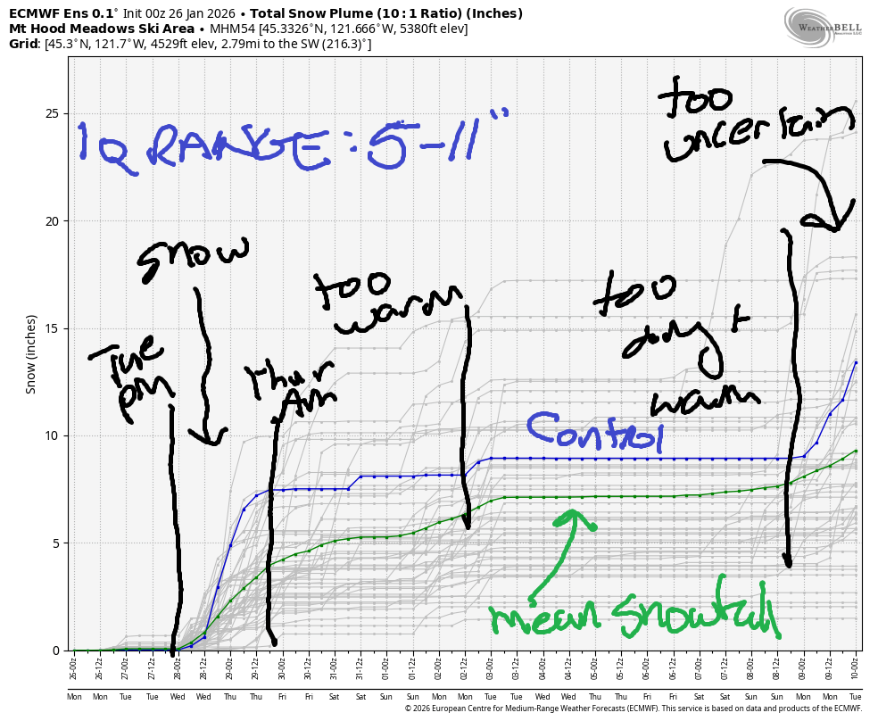 Hey skiers and snowboarders! It’s Monday, and it’s another dry day on Mt. Hood. This long dry spell comes to an end on Tuesday afternoon. We’ll pick up some snow Tuesday night into Thursday morning, after which temps warm again. A lot of uncertainty remains in the details of the incoming precipitation. The ECMWF brings in 0.9” to 2.0” water equivalent this week, and the intraquartile range for snowfall is 5” to 11”. As you might have surmised, it’s likely we’ll see at least some rain in this time period after the snow falls. Fingers crossed it’s minimal! After Thursday, the weather is likely to turn warm and dry again, although we may see some rain Saturday and also early next week.