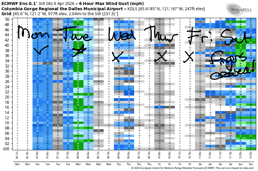 As an almost-unnoticeable weather system swings through overnight into Tuesday morning, the wind picks up and a few high clouds move in. Despite cooler temps aloft (as low as 0C), we shouldn’t’ see frost thanks to the fuckin’ restless, constantly-moving air. Temps start in the 40-45 range most places and rise to 60F (west), 63F (The Dalles), and 67F (The Desert). Tuesday morning wind will be 20-25mph early west of Lyle and East of The Dalles with 15-20mph in between. Afternoon wind falls to 15-20mph between Stevenson and Rufus and drops below 15mph to the east of Rufus. Up in the hills: also fuckin’ windy.