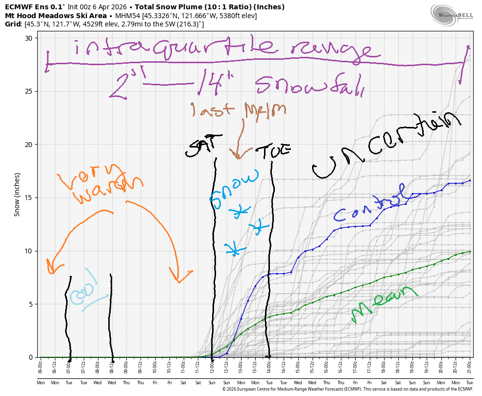 Hey skiers and snowboarders! Another sunny and (mostly) dry week is on tap for Mt. Hood. In an ironic twist, cooler temps and a little snow are likely for closing weekend at Mt Hood Meadows. Beyond next Sunday, uncertainty is quite high – the range for 850mb temps is 0-8C (approximately) through the 21st of the month, the end of this particular model run. In other words, no conclusions can be drawn, but snow is an unlikely outcome beyond next Monday.