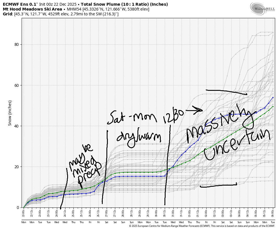 Extended: light mixed precip or potentially snow is forecast Thursday into Friday. By Saturday, a ridge arrives. We’re looking at warm, sunny conditions for a few days. Models are uncertain when this ridge will break down; starting Monday, uncertainty is quite high with over 10C of range in the 5000′ temps. Generally speaking, the temps look to be on a downward trend after Monday, and precip looks to be on an upward trend. Let’s cross our fingers for now and leave the forecast at that. Hope to see you on the snow soon!