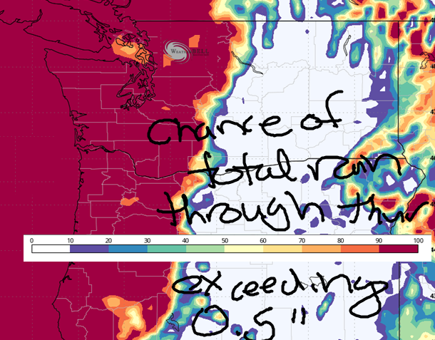 Cooler, showery, rainbow-likely weather is in the cards Wednesday. Showers increase after 2pm thanks to instability generated by surface heating and cold air aloft. How cold? Well, the snow level will be 6000-7000′ on Wednesday! Temps max out at 65F (west), 70F (The Dalles) and 73F (desert). Wind will be light/variable in the morning and evening with westerlies at 15mph between Stevenson and The Dalles early afternoon. Cool, showery weather continues on Thursday. Cool, probably-not-wet weather is forecast for the Friday, Saturday, and Sunday period. After this week’s wetness, the next chance of rain appears to be at the end of next week, and that’s only a maybe for now; starting next Wednesday, the range of possible temps/precip/etc is massive. Ginormous. Mega-huge. Like my pumpkin. Safe travels. -TATAS