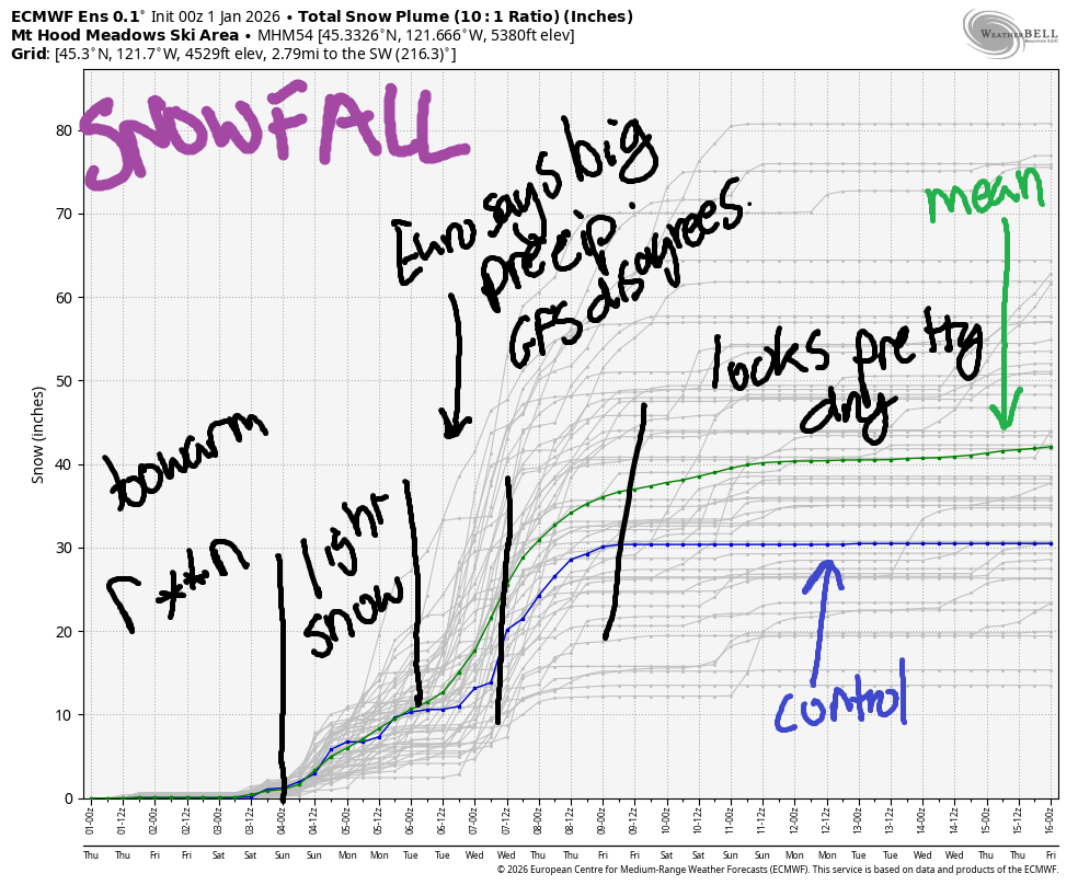 Sunday looks dry during the day with a trace of wet snow or light mixed precip overnight. Light snow is forecast Monday and Tuesday. Models disagree on what will happen on Wednesday. The euro drags in tropical moisture and mixes that with colder air coming from the northwest. This scenario could result in a big snow dump for Mt. Hood. The GFS, on the other had, just brings in light to moderate snowfall. Beyond that, models agree on cooler weather to end next week followed by higher levels of uncertainty. So… generally speaking, we’ll have rain through Saturday followed by cooling weather and some sort of snowfall for much of next week. Fingers crossed the improved intraquartile range plays out. A big dump would be awesome! Happy new year, everyone!