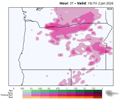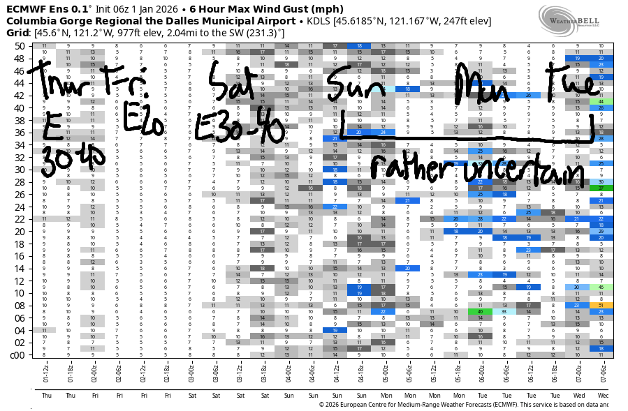 Good morning, neighbors! The Gorge is finally behaving like its prickly self – freezing rain is falling in many areas this morning. Happy new year – you get ice! For some of us down low, all we’ll see is rain. For others in colder areas – Parkdale, Middle Mountain, Stabler, Husum, Trout Lake, south Wasco, the icing could continue into Friday. Beyond that, we just have regular old boring weather. Next up in weather excitement is the potential for heavy rain (ECMWF) or regular old rain (GFS) sometime around next Wednesday.