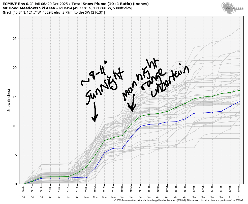 Hey skiers and snowboarders! Much calmer weather is in the Mt Hood snow forecast for the next five days or so. Cool temps linger, and we’ll add to the snowpack. The intraquartile range (25th to 75th percentile snowfall) calls for 12-18” through Christmas Day. Resorts are doing their best to clean up messes from the recent storms and get something open.