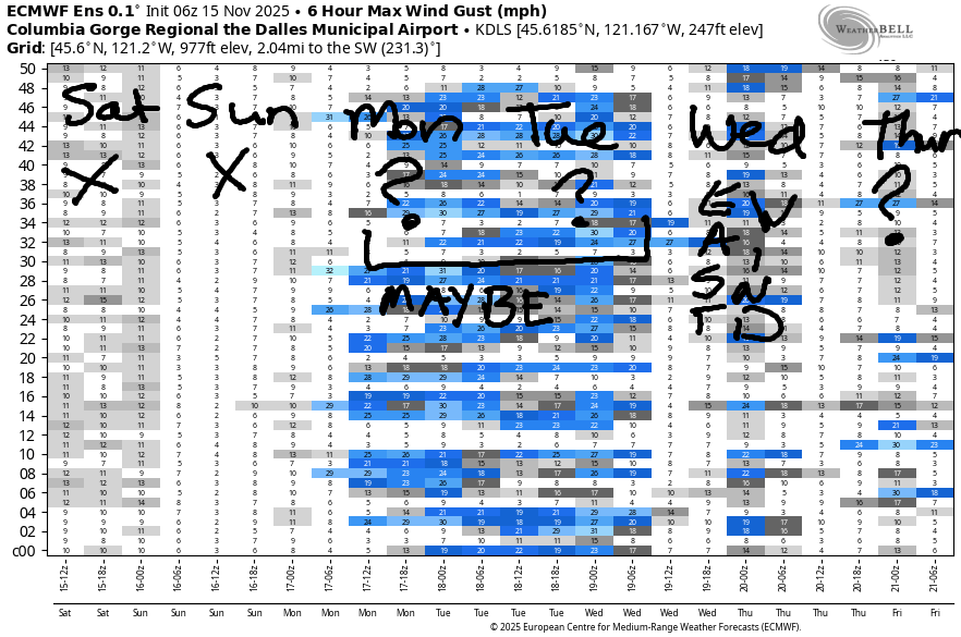 Monday brings a cold front through with high pressure building behind it. This carries the potential for westerlies after the rain finishes up. Ensembles are far from certain about this. While the GFS deterministic insists we’ll see mid 20s east of The Dalles, the ensembles do not. Given the setup, I think our best chance is from Viento to Doug’s. My fingers are crossed. Westerlies are possible again on Tuesday, but they look lesser than on Monday. High pressure builds inland on Wednesday and sets us up (probably) for all-day east wind with dry weather. Okie dokie. That’s as far into the future as I’m guessing. Have an awesome day today!