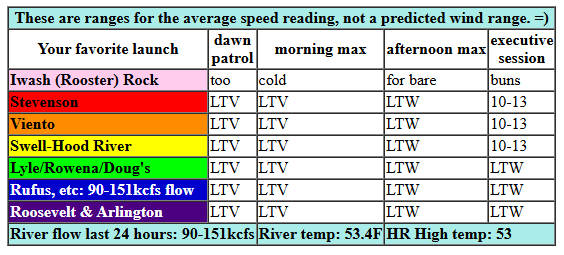 Saturday kicks off with light/variable wind and very light onshore gradient. The wind turns light westerly this afternoon, under 10mph, and picks up to perhaps 10-13mph from Stevenson to the Hatch after 4pm. River flow over the last 24 hours was 90-151kcfs, river temp is 53.4F, and high temp forecast is 53F.