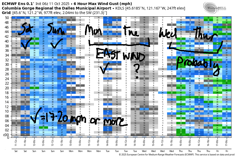 Monday sees a low settle offshore. Easterlies result. These easterlies won’t be confined to the river, and thus they’ll be lighter than gradients and models suggest. Call it 20-25mph at Iwash, 20mph at Stevenson, 15-20mph at Viento, and 10-20mph from Hood River eastward, especially away from the river and up in the hills, where the easterlies will be strong. High temp: 52F for Hood River. Some sort of easterlies, perhaps 20-25mph at Stevenson, are forecast Tuesday. Wednesday: potentially west wind. Thursday and Friday: potentially strong west wind. Fingers crossed. See you on the Nch’i Wana!