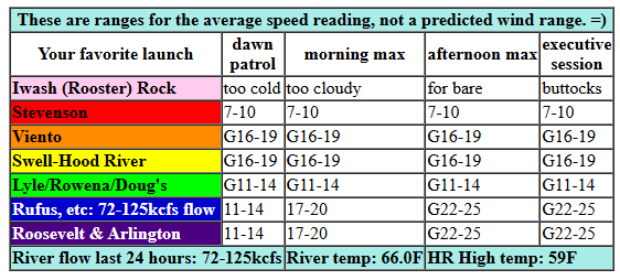 Let’s look at this morning. It’s Saturday, and I’m running late because I led a meditation group this morning. But hey, that’s my fav thing, so I’m happy for me! Today’s wind is brought to you courtesy of a system moving through. Most locations were under 10mph to start the day, but Viento-Hatch was reading 16-19mph. Models give us gusty, intermittently drizzly 15-20mph from Viento to the Hatch this morning. They suggest the wind will rise to gusty 22-25mph from Avery to Arlington this afternoon and hold. More intense, more widespread rain arrives around 5pm, so be ready for the west side to really drop off. River flow over the last 24 hours was 72-125kcfs, river temp is 66.0F, and high temp forecast is 59F for Hood River and 63F out east.