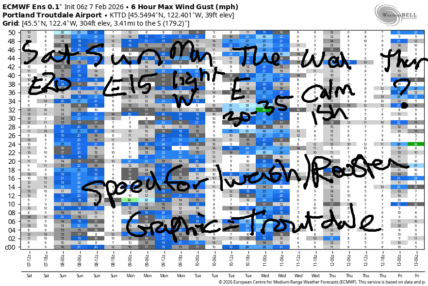 Hi friends! Not much happening in the next five days or so – strongest day looks like next Tuesday when easterlies may rise to 30-35mph at Iwash/Rooster Rock. Saturday starts off with pressures of 30.16/30.24/30.22 and easterlies under 20mph in the usual spots. By midday, the wind goes calm. It turns light westerly overnight before turning easterly again on Sunday. River flow over the last 24 hours was 147-187kcfs, river temp is 41.0F, and high temp forecast is 48F under cloudy sky with rain from mid-morning on.