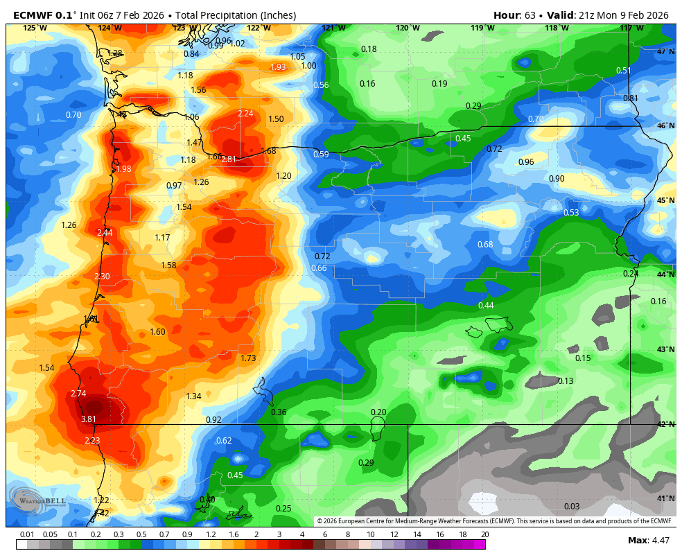Monday sees intermittent morning drizzle as far east as Hood River with a dry, mostly clear afternoon. Morning temp: 40ish with a few flurries possible above 2000′. Afternoon 49F to the west, 52F in The Dalles, and 54F way out east in the desert. Wind will be light westerly all day which is likely to fire off some rainbows.