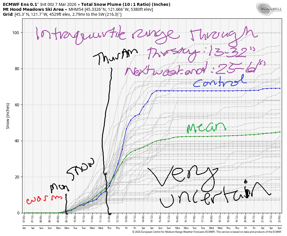 Hey skiers and snowboarders! It’s a windy one on Mt Hood this morning, and wind sticks around in the forecast today. With a forecast of NW 30 on the sounding model, we’re tip-toeing around what lifts can handle. Fingers crossed! Looking ahead, we have a cold front taking the snow level back down to the snow zone on Sunday followed by snow for the early part of next week. Starting early Thursday, massive uncertainty is present in the models; it’s really impossible for me to give you anything more than a broad-brush forecast for this upcoming week. That said, the intraquartile range through early Thursday for snowfall is 13-32”. Through next weekend, it’s 25-61”. See why I can’t predict it?!?!