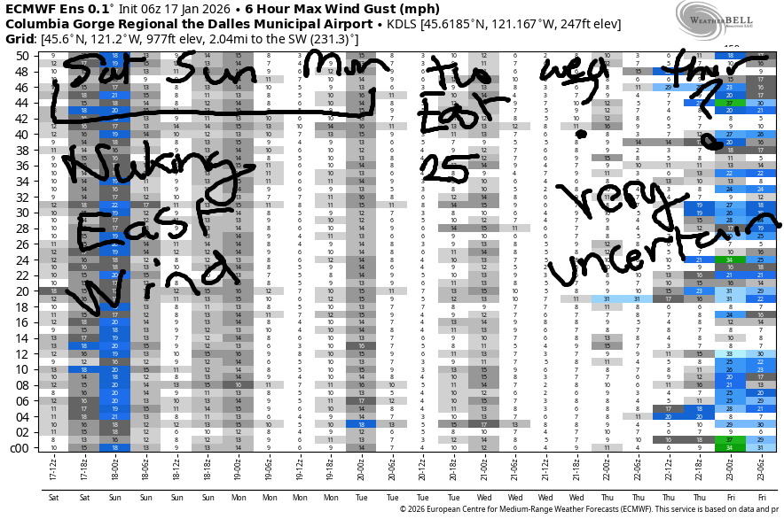 Sunday sees the pattern break down just a little. Easterlies hold at 40-50mph all day at Iwash and hover around 30mph at Stevenson. High temp: 43F with sunshine in the windy zones. Monday looks just like Sunday.