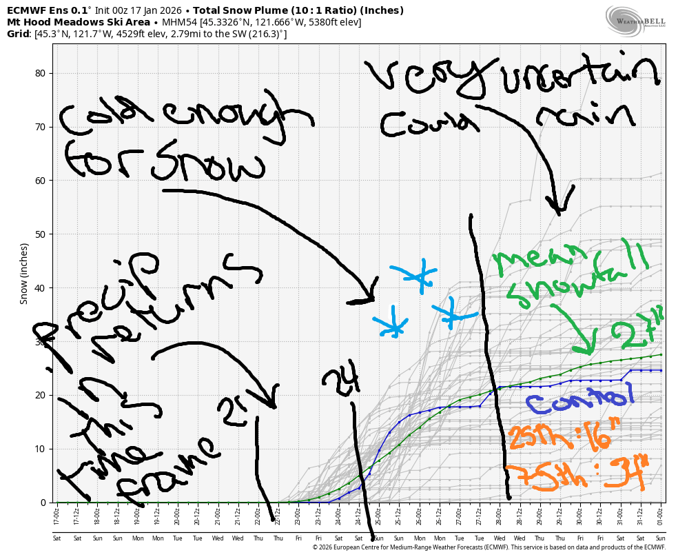 Hey skiers and snowboarders! Dry weather continues through the middle of next week. Extensive uncertainty is present in the models starting around next Wednesday – while it does appear there’s some moisture headed our way, and while it does appear it will be cold enough for snow for at least a few days, it’s impossible to predict the details. That’s quite clear when we look at the intraquartile range for snowfall through 1/31: the 25th percentile calls for 16” of snow on Mt Hood by the end of the month, and the 75th percentile has 34” of snowfall. As always, vote for the high end!