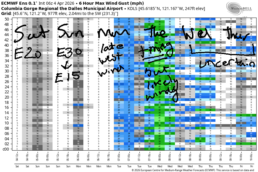 Another warm start is forecast on Monday as temps at 850mb (5000′) hover around +11C. Clear sky in the morning gives way to partly cloudy sky in the afternoon. Max temps… wait for it… 74F to the west, 77F in The Dalles, and 79F in the desert. HOT! After a calm start, westerlies slowly build to 20-25mph between Hood River and The Dalles late in the day. Strong westerlies persist overnight. This upsets the Boardheads – they prefer strong wind to occur in the daylight hours.
