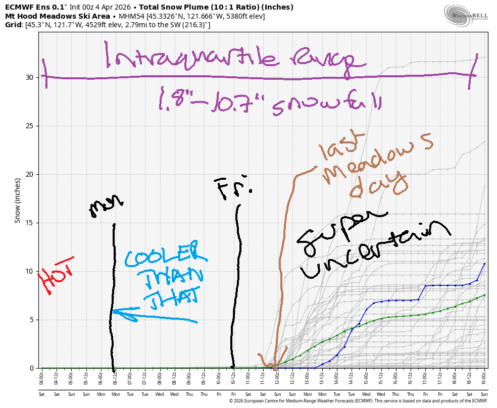 Hey skiers and snowboarders! Ski season keeps on keeping on. Today’s going to be a warm and sunny day on the slopes. Timberline and Meadows have made it their mission to stand up against Ma Nature and get you as much skiing as possible. Get it while you can! We’re expecting basically zero precipitation through next weekend. Temps will be warm on the slopes through Monday and will turn cooler starting Tuesday. With cooler temps next week, we should see the snowpack refreeze. That would give us some awesome days of corn snow!