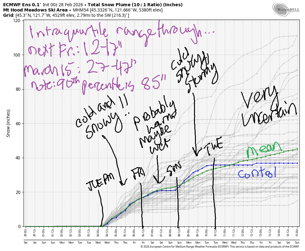 We’ll stick with dry weather until Tuesday afternoon when honest-to-goodness snow is in the forecast. The intraquartile range through next Friday is 12-17”, and the range through 3/15 is 27-47”. It’s worth noting that the 90th percentile is 85” – that huge range is due to both fluctuations in temp and the potential for snow to exceed expectations thanks to W/NW wind.