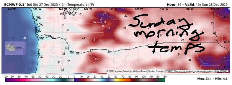 Overnight into Sunday, temps fall below below freezing as the dewpoint dips into the teens away from the Nch’i Wana (Columbia River) and the upper 20s near it. This (probably) results in a partial Nothing near the river and freezing fog for some folks. For the rest of us: black ice is likely to start the day, and it’s possible all day long in shady areas. Be careful out there. By afternoon, temps warm to 40F or so (mid 30s way out east). Calm wind starts the day. East wind at 25-30mph in the usual spots (Stevenson, Iwash Rock) finishes up.