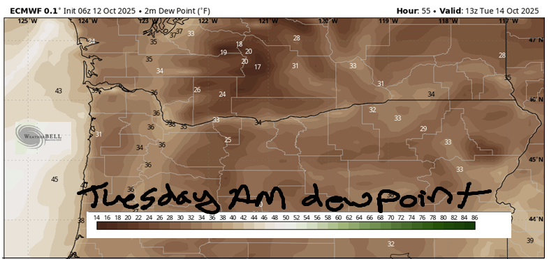 Ah yes, Monday. We start with drizzle as far east as Arlington. Rainfall slowly fades from east to west. It ends in South Wasco around 11am and ends in The Dalles around 2pm as a dry cold front sweeps in from the NE. Accompanying this system will be moderately strong east wind all through the Gorge: 25-30mph near Iwash Rock and Stevenson with 20mph east of Viento all the way east into the desert. Up in the hills: east wind at 20-30mph. This dry system starts to scour out the clouds except in places favored for easterly orographic effects, where rain continues until the air really drys out: Dufur, for example… any places along the east slopes of the Cascades. Highs: 50F to the west and 55F for The Dalles and 59F in the desert.