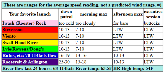 Looking at today, we have the lingering effects from a system that moved thought overnight. Westerlies are generally in the 10-13mph range west of The Dalles. Out east, the day started with 20ish near Rufus and 30ish between Arlington and Threemile. That wind is going to drop quickly. By midday, the west side will be holding at 10-13mph, and the east side will be down to 15-18mph. By mid-afternoon, as rain increases, the entire Gorge drops below 10mph. So you might as well go to the naked bike ride in Portland. What else do you have to do today? River flow over the last 24 hours was 68-114kcfs, river temp is 65.5F, and high temp forecast is 54F for Hood River and 58F out east.