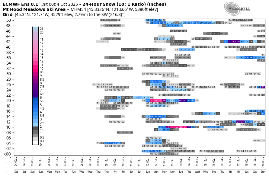 Good morning, neighbors! I gotta keep it quick today – it’s giant pumpkin weigh-off day at Bauman’s, and I got 2 pumpkins and a giant watermelon to get down there. And work to do measuring everyone else’s pumpkins! Generally speaking, we have a cloudy day today, sunshine, east wind, low humidity, and potential for scattered frost Monday, and a wetter, cooler pattern starting Wednesday (probably). In a fun twist (see image), we have our first signs of snow popping up in the (rather useless, but still fun) ECMWF ensemble for Meadows. Snow! Yay!
