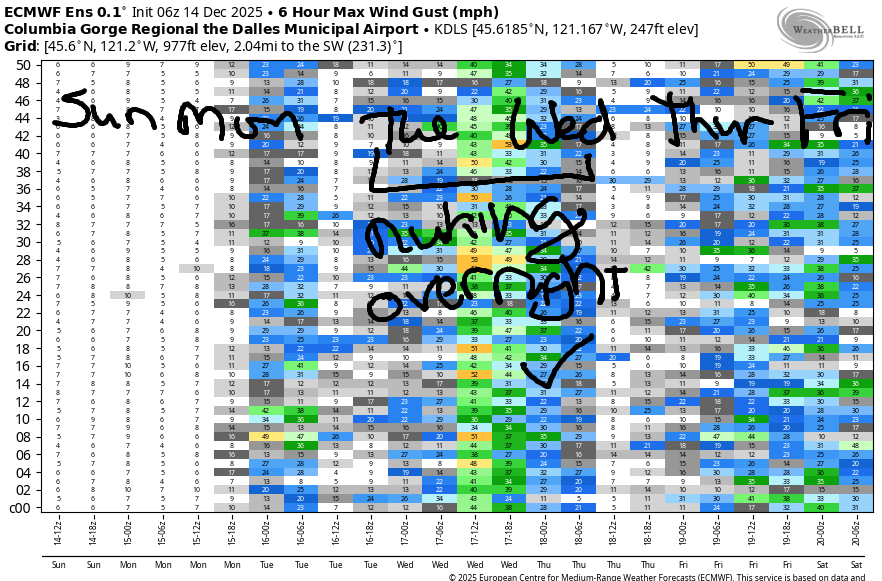 Overnight Tuesday, probably after 10pm, the wind goes nuclear all the way from the Multnomah Falls area out into the far eastern desert. Westerlies linger into Wednesday, probably in the mid 20s, but we’ll check that out more closely as we get nearer. That’s enough for now. Hope to see you on the Nch’i Wana soon!