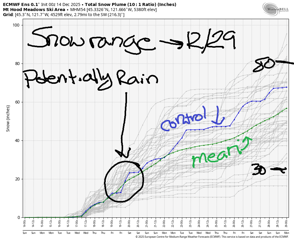 Moderate snowfall, perhaps another half a foot, is forecast on Wednesday with the snow level around 2000′. Light snow continues into Thursday, when we encounter the newly-disappointing next system, which is almost certain to have an extended period of the wrong type of moisture. This is (obviously, given yesterday’s forecast) a rapidly evolving forecast, so we’ll look at it again tomorrow. In the meantime, let’s take a look at some other numbers: the 25th-75th percentile spread for snowfall through next Saturday on Mt Hood is 17-33”. That should be enough to get something open especially given the cold, snowy long-range forecast. OK. Fingers crossed. See ya tomorrow!