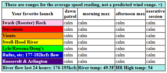 Sunday looks calm all day. River flow over the last 24 hours was 176-193kcfs, river temp is 49.3F, and high temp forecast is 54F under cloudy sky. Monday starts with light east wind. Thanks to an incoming system, westerlies pick up to gusty 17-20mph (ish) from Stevenson to Viento and near Arlington. Low 20’s (more out east) are possible in the evening, but probably not before sunset. High temp: 59F with rain. Tuesday starts calm. Westerlies rise to 15-18mph midday from Stevenson to Viento.