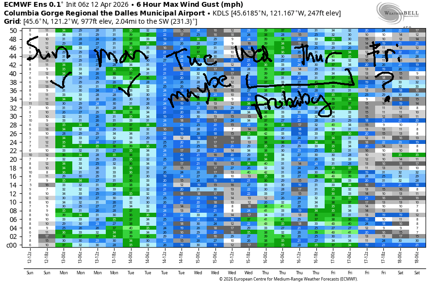 Tuesday sees a strong cold front approaching. Wind starts at less than 10mph west of The Dalles and 13-16mph from The Dalles to Arlington. Afternoon wind rises to 22-25mph from Avery to Arlington. Stevenson-Viento climb late afternoon to the mid 20s ahead of the approaching weather system. Will the Hatch join? Maybe, but it’ll be super up-and-down if it does!