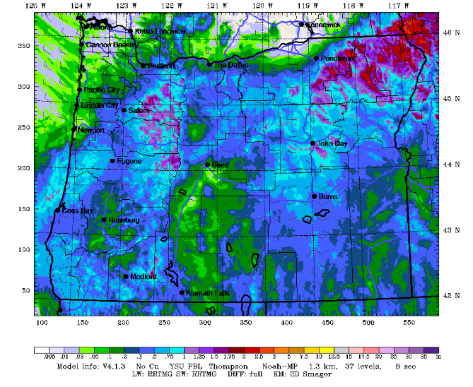 Since today’s system is coming from the south, there won’t be a rain shadow from the Cascades. The farther south you are, the more rain you’ll receive. South Wasco, Gilliam, and Sherman Counties along with Parkdale could see up to 1/2”. Ditto for areas between Troutdale and Cascade Locks. Farther east along the 84/14 corridor and to the north: 0.1” to 0.25” with a few select areas getting more (see image). Temps max out around 60F (west), 63F (The Dalles), and 66F (The Desert). After a calm start, the wind picks up to 15mph west of The Dalles and 20-30mph east of The Dalles all the way to Hermiston. Heading to/from Portland? Heaviest rain for that drive will be 2pm to 8pm.