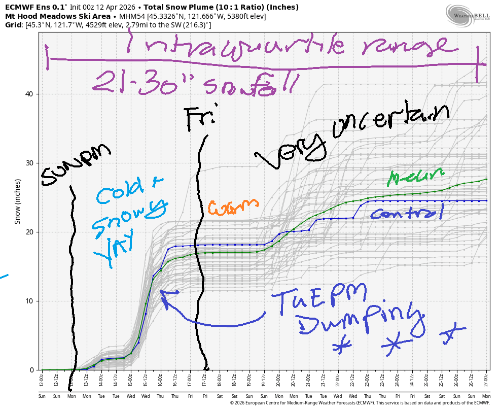 Hey skiers and snowboarders! Last day for Meadows is today. Timberline will keep it going, which means you T-Line passholders have a shot at a pow day on Wednesday! After that, it’s probably time to end the snow forecast for the season.